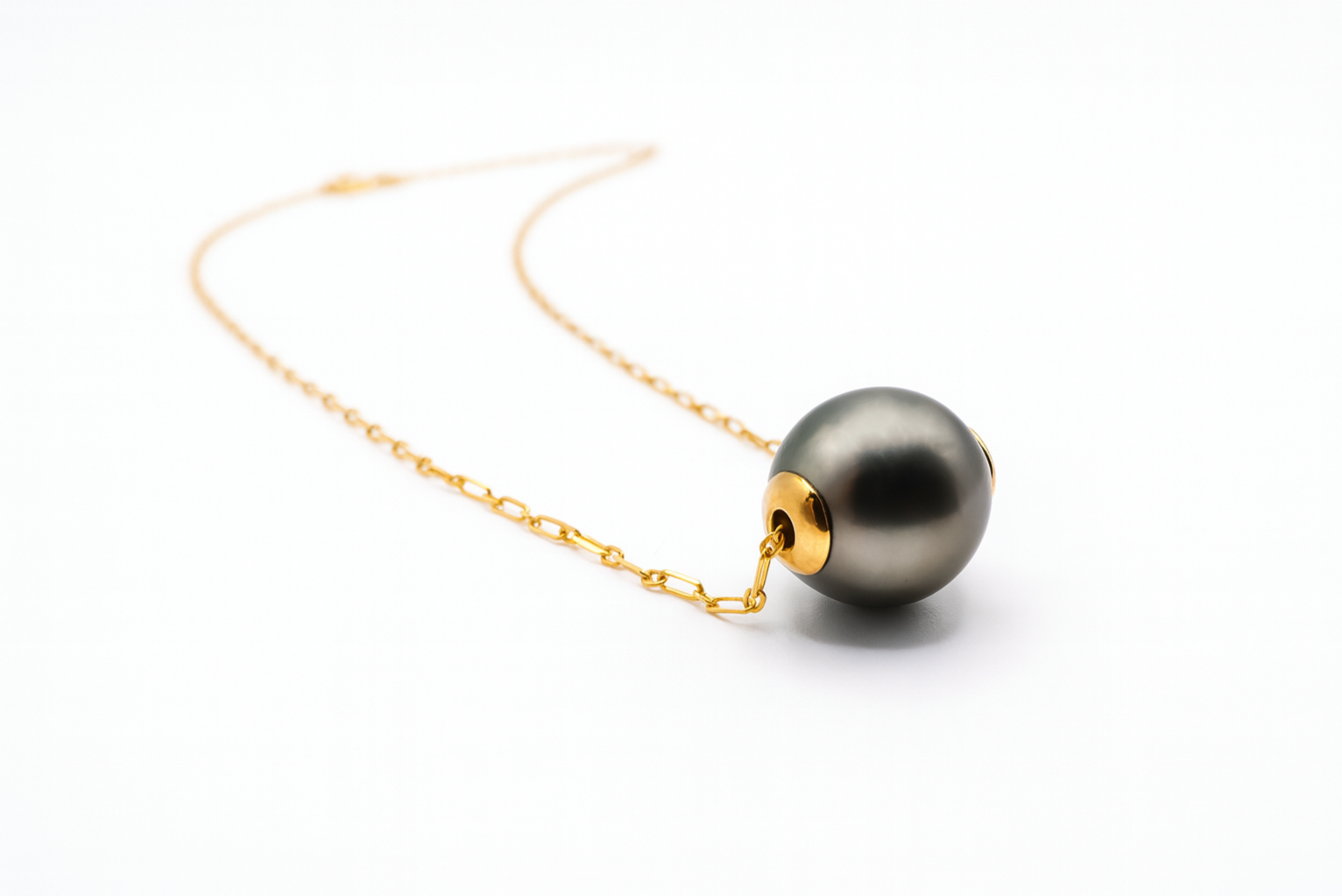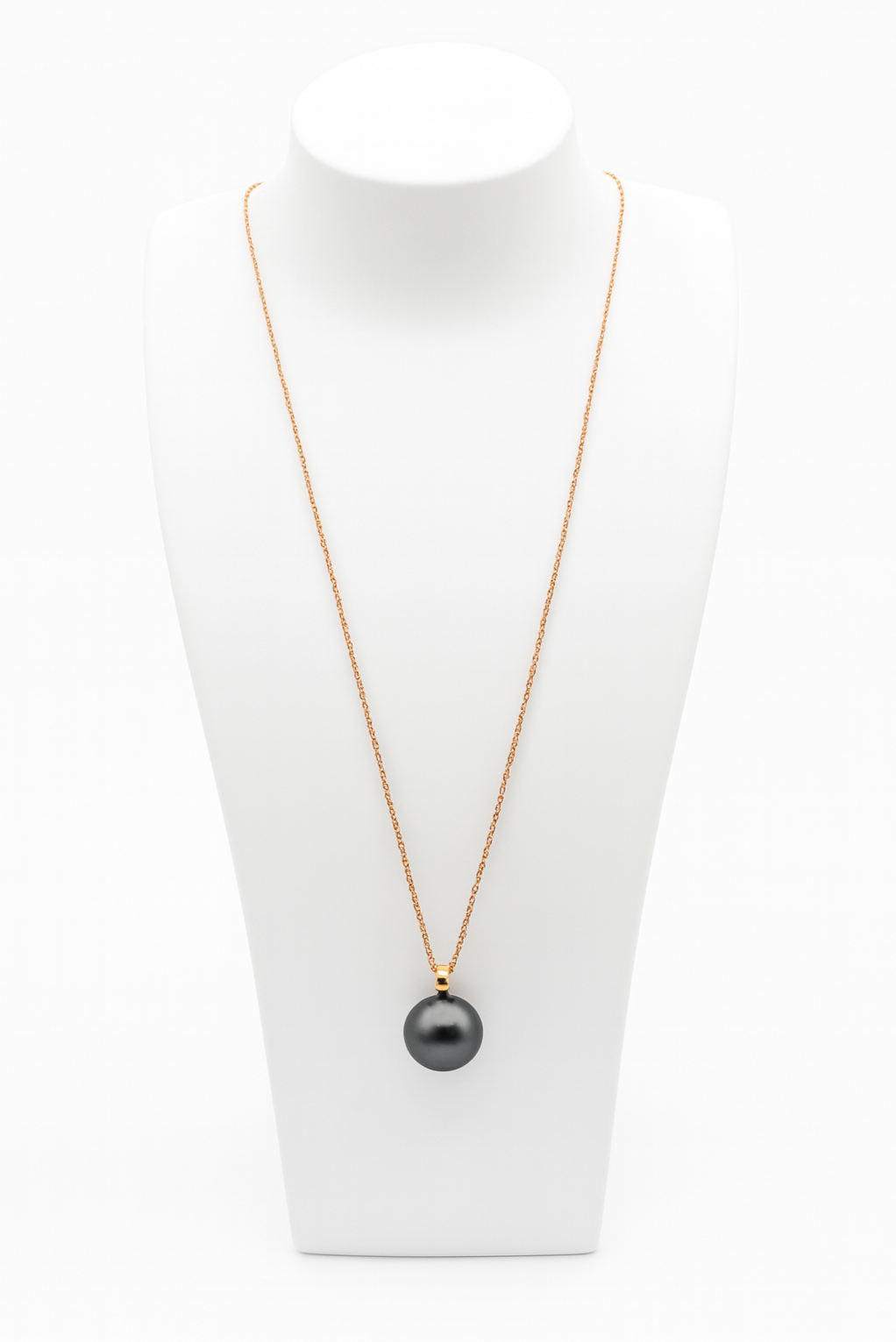 Colgante tipo gargantilla. Realizado en oro de 18 Kts con una perla central de Tahití, calibrada en 13,5 mm. Y rematada en ambos lados con oro de 18 Kts.