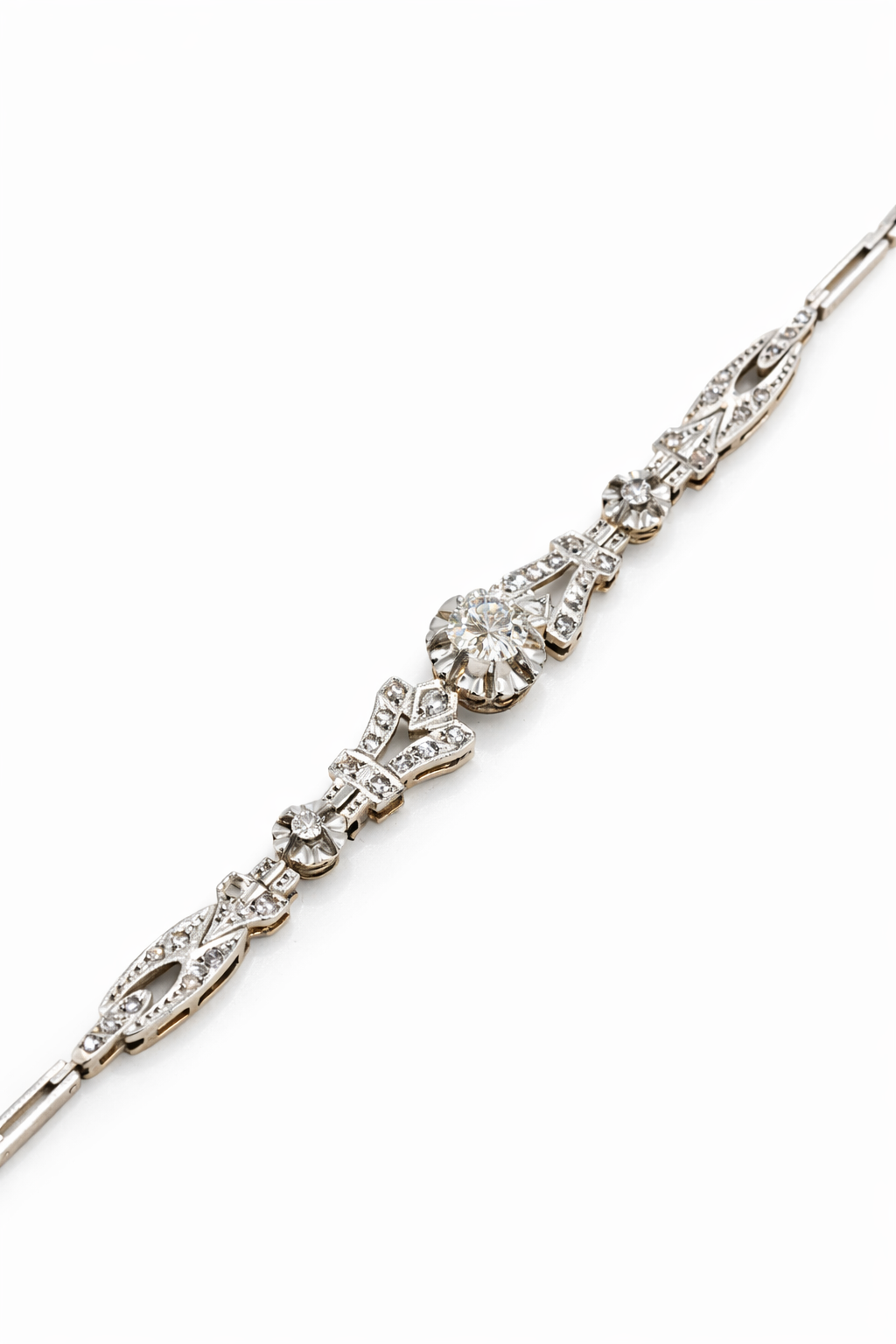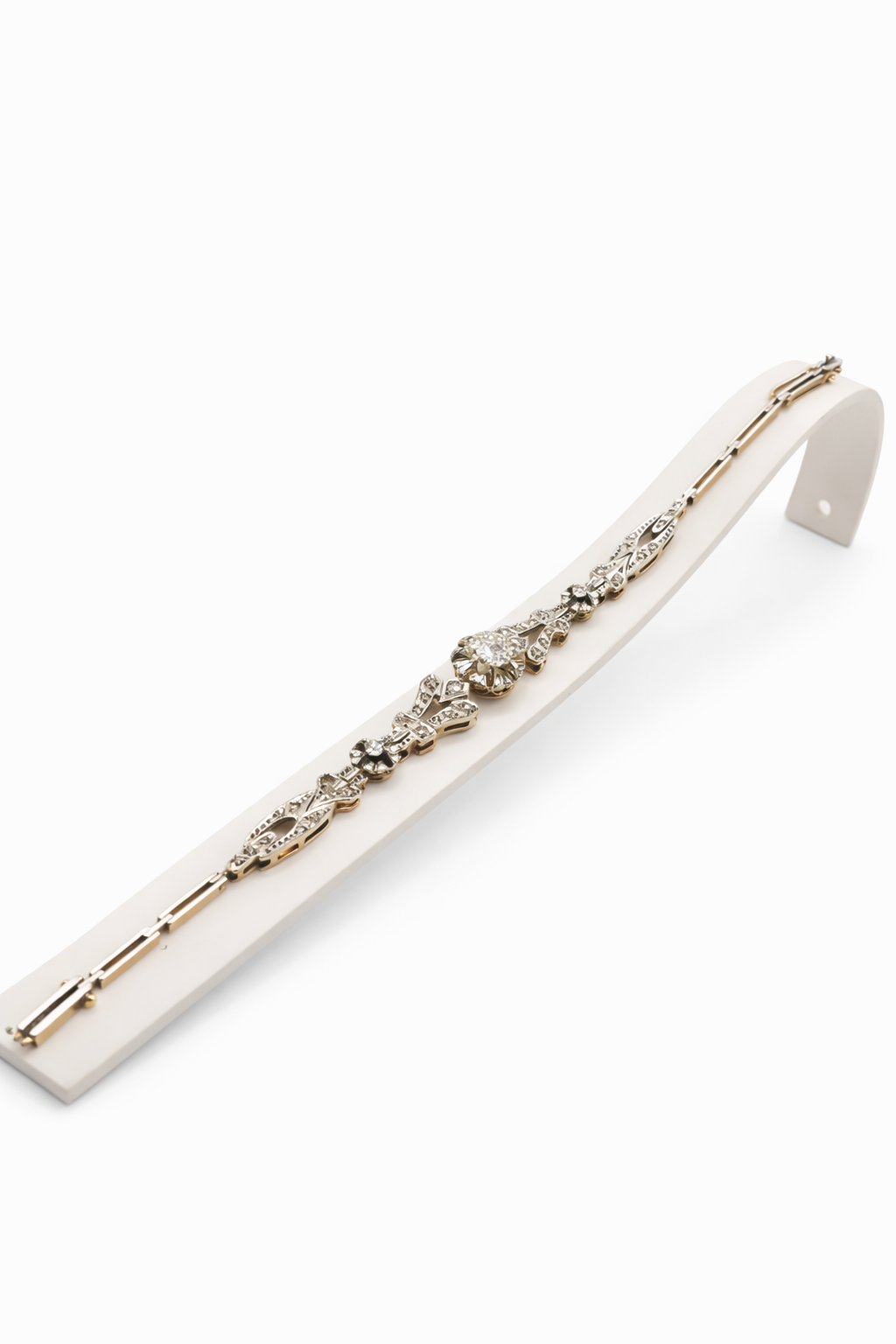 Pulsera antigua tipo de pedida, realizada en oro 18 kts y vistas de platino, con un diamante central talla brillante antigua. Peso aproximado: 0,63 cts. Acompañado por treinta y seis diamantes talla rosa.