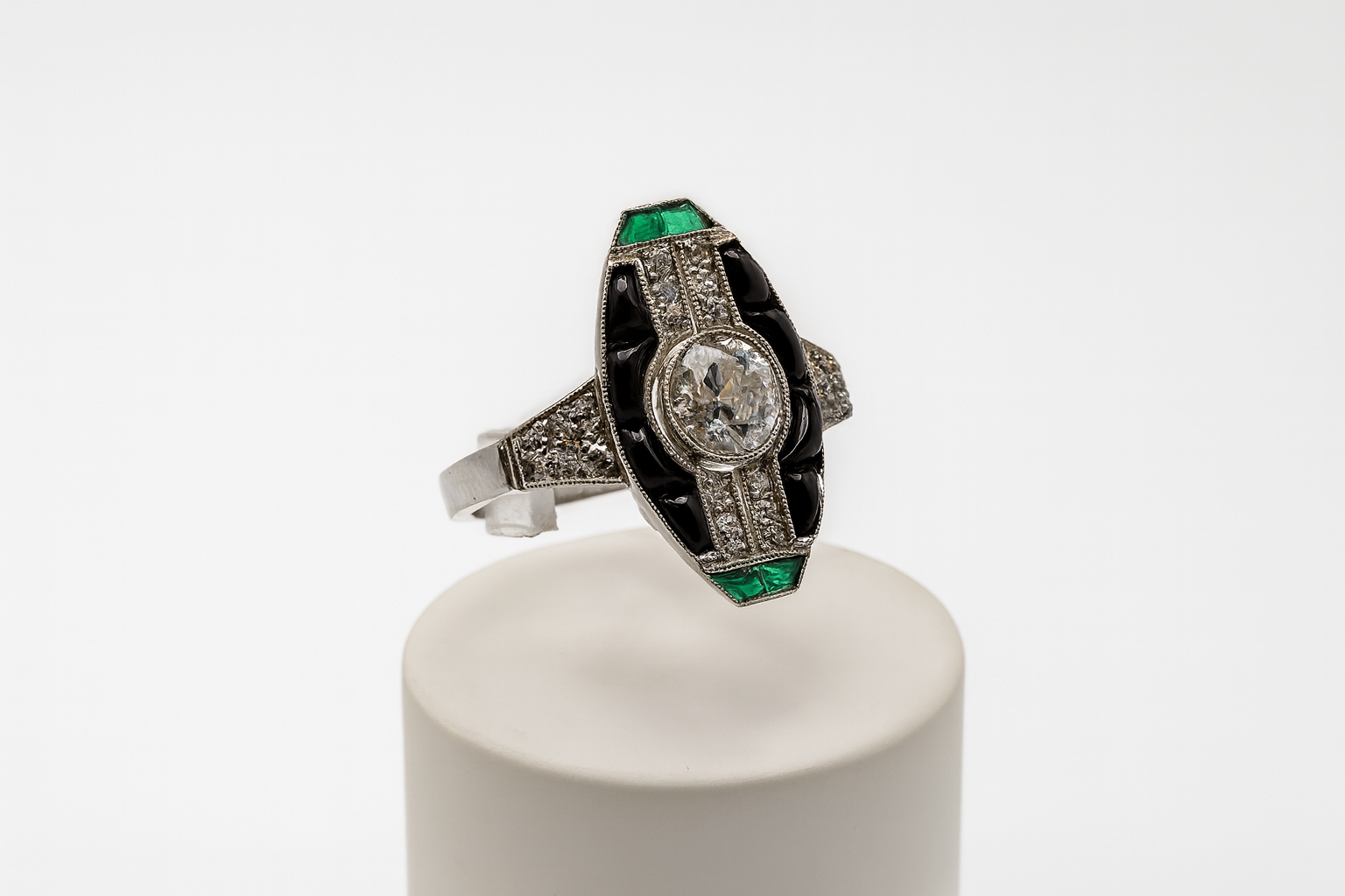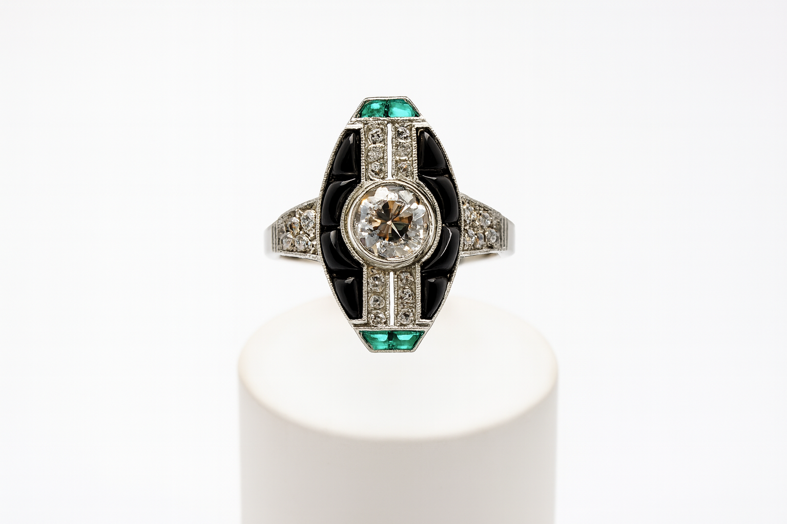 Sortija Art Decó realizada en platino con diamante central talla brillante antigua peso aproximado: 0,55 cts. Acompañado por esmeraldas talla carré. Peso total aproximado: 2 cts. Y cuatro piezas de Ónix.