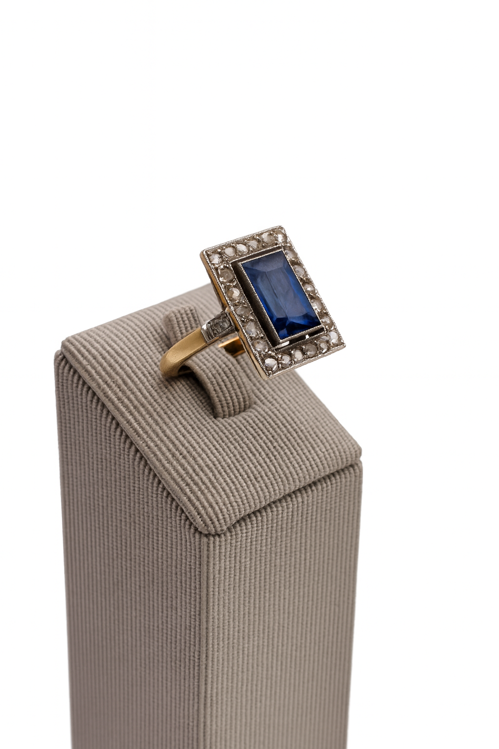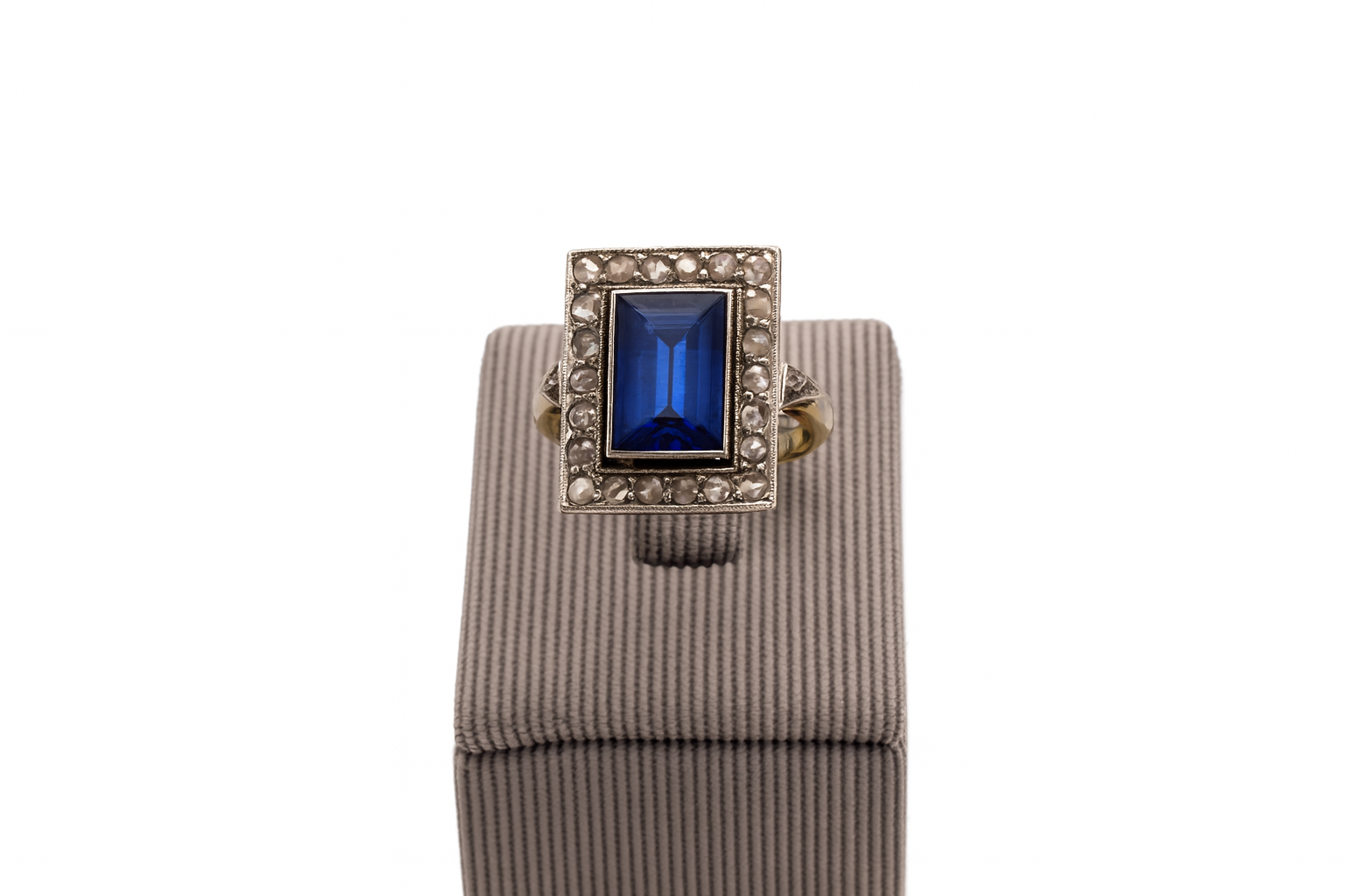 Sortija art decó en forma rectangular, realizado en oro de 18 Kts y vistas de platino. Con un zafiro sintético, de la época, orlado por veintidos diamantes talla rosa.