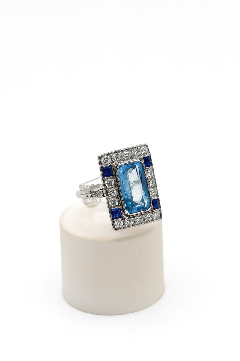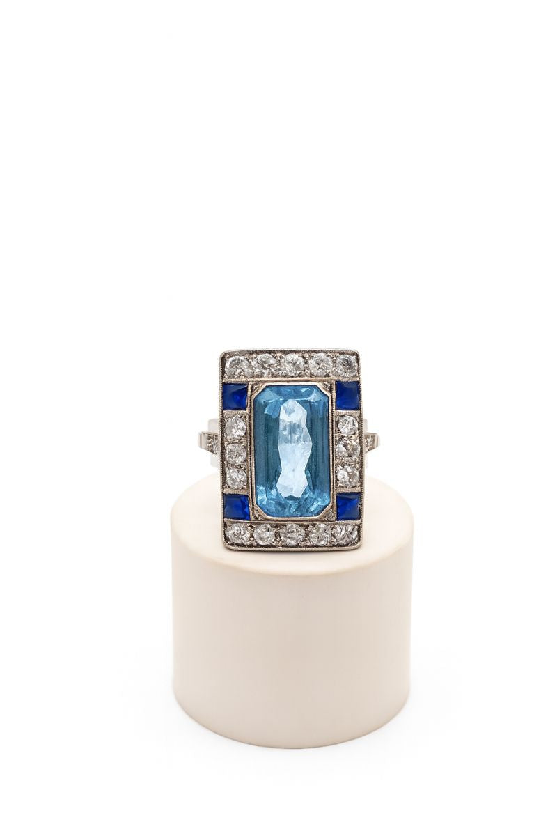 Sortija art déco realizada en platino con una espinela central, orlada por diamantes talla brillante antigua. Peso total aproximado: 0,85 cts. Y cuatro zafiros sintéticos.