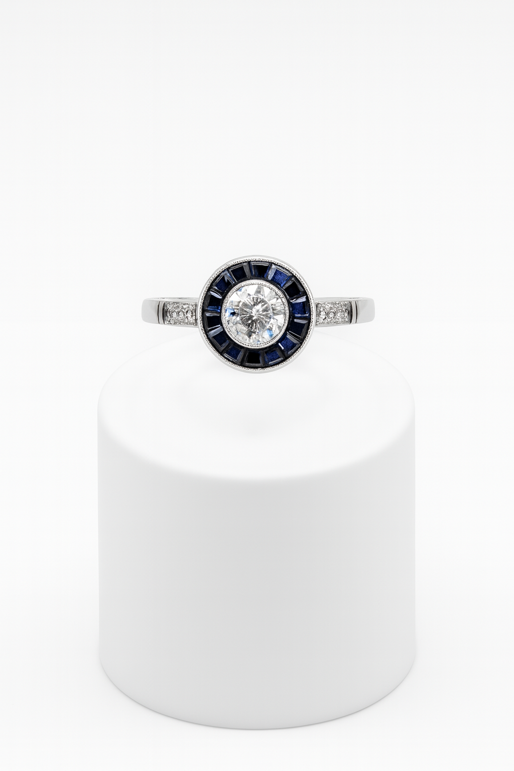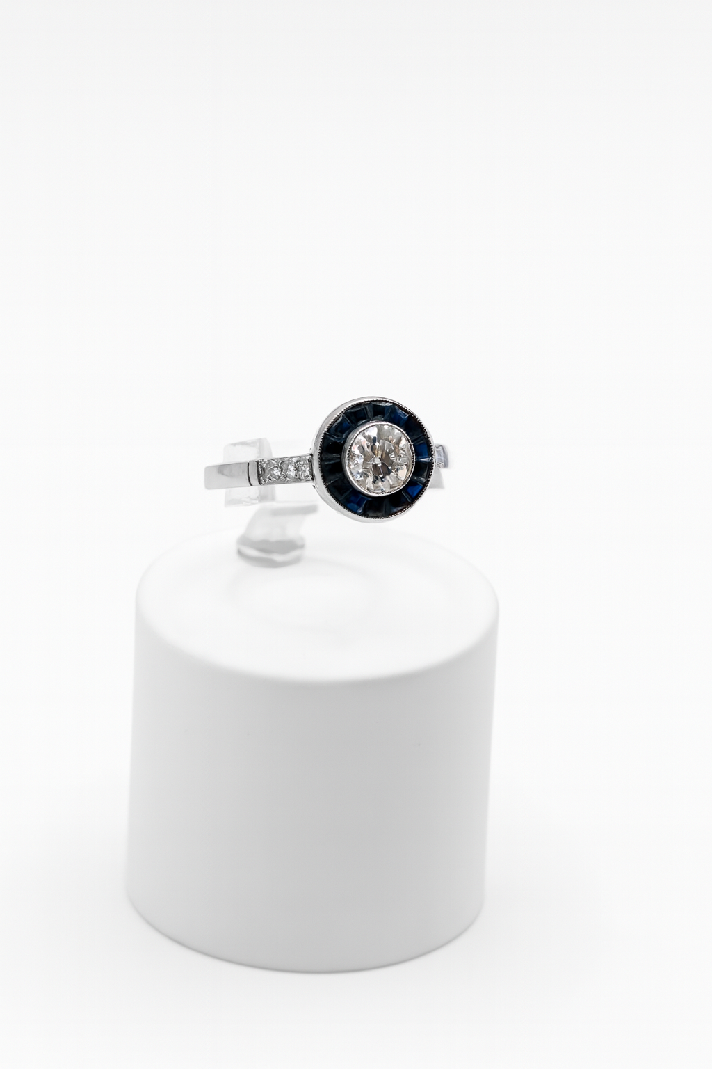 Sortija art deco tipo ojo de perdiz, realizada en platino, con un diamante central talla brillante antigua peso aproximado: 0,55 cts. Orlado por zafiros talla carré y diamantes en los brazos.
