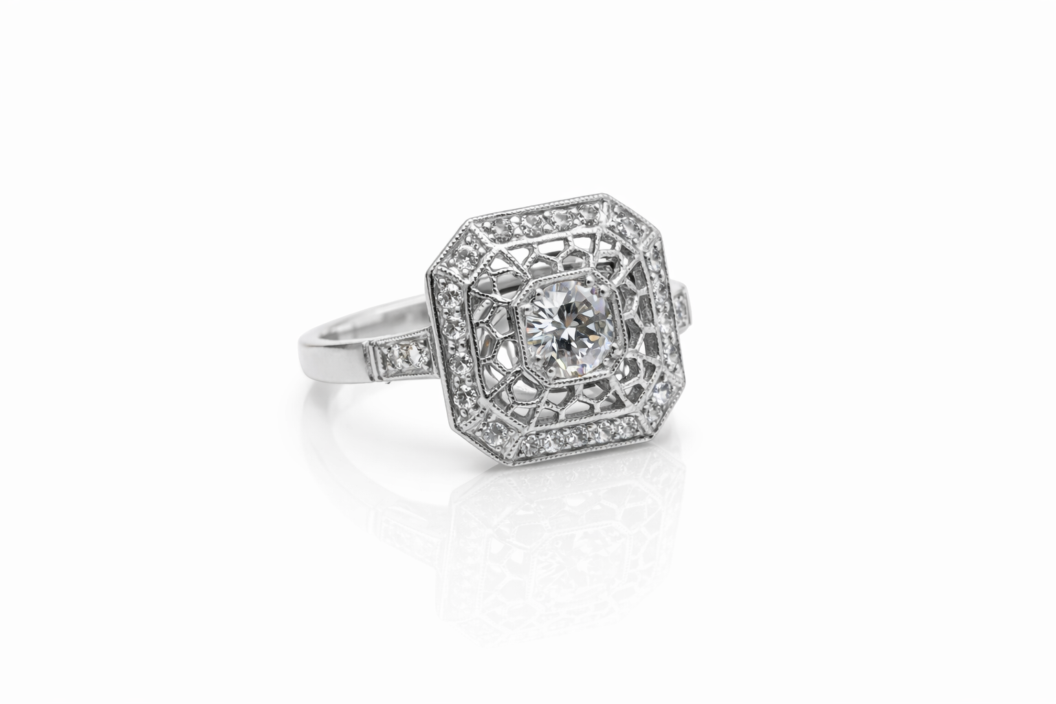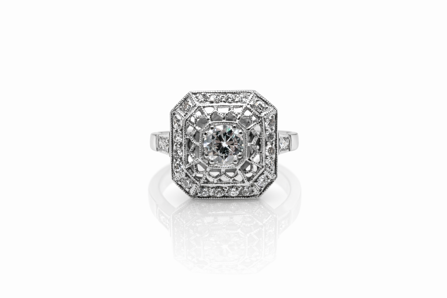 Sortija estilo art deco realizada en platino con un diamante central talla brillante antigua. Peso aproximado: 0,52 cts. Acompañado por veinticuatro diamantes talla brillante con un peso total aproximado 0,48 cts.